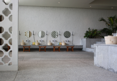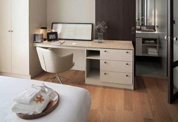 A serviced apartment in two different styles, retro or vintage, surrounded by greenery.