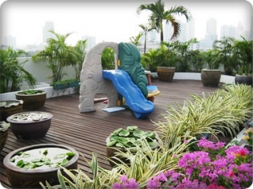 A neat appearance with flowers on the balcony in a pure white building. The large balcony surrounding the room brightens the impression of the room. It is close to Thonglor Station.